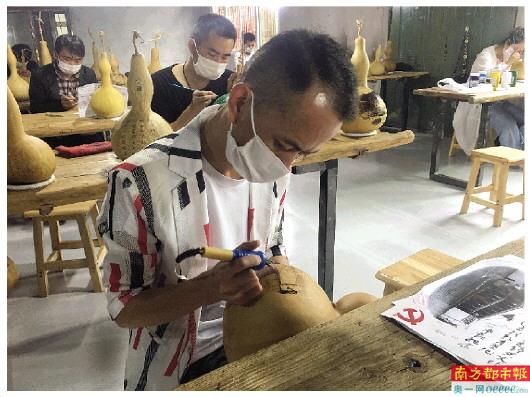 黄义是黔西本地人,家庭贫困,他在县就业服务中心看到扶贫车间的招聘广告后报名入职。“将葫芦收回来烘干后,我们就开始在上面作画、刻画。”黄义说,自己是零基础,经过两个多月的培训,慢慢开始熟悉作画。“一开始刻坏好些葫芦,好在后来学会了。”