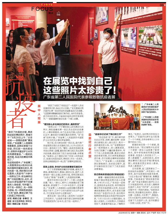 “亲历了抗疫的过程,再看到这些珍贵的照片,思绪万千!”8月28日上午,“众志成城——致敬抗疫者”展览现场,广东省第二人民医院党委委员、副院长黎程十分动容。回忆起一线抗疫经历,该院手术室副护士长刘优凤哽