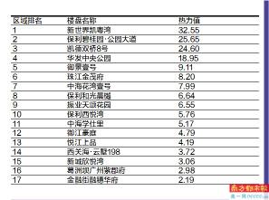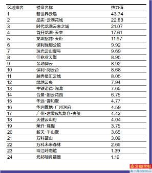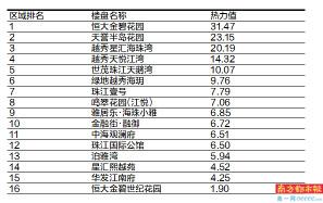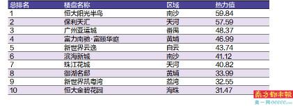 根据热力值得分高低排列,恒大阳光半岛以59.84的热力值位居榜首;紧随其后的是保利天汇,得分为57.59;广州亚运城挤进前三,热力值为48.37分。富力南驰·富颐华庭、新世界云逸、滨海新城以及珠江花城得分均在40分以上,分列榜单的4-7名。御湖名邸、新世界凯粤湾及恒大金碧花园争到了TOP10的最后三席,前十门槛定格在31.47分。