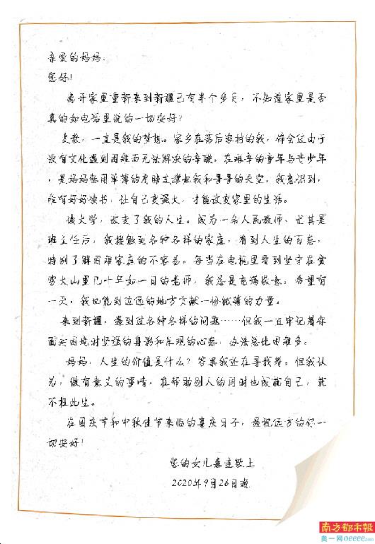 今年中秋节,是佛山惠景中学教务处副主任江森连在新疆喀什伽师县过的第二个中秋节。自江森连偷偷瞒着母亲递交了支教申请表,前往新疆成为一名支教老师,已有一年半。支教,一直是江森连的梦想,到边远的地方贡献一份力量也是她的信念所在。在新疆,她遇到过各种各样的问题,妈妈面对困境时坚强的身影和乐观的心态对她影响很大。她认为做有意义的事情,在帮助别人的同时也能成就自己,不枉此生。作为一名支教老师的她亦是一个“女儿”,每逢佳节倍思亲,江森连写家书一封,通过文字表达自己对远在佛山的母亲的思念和牵挂。