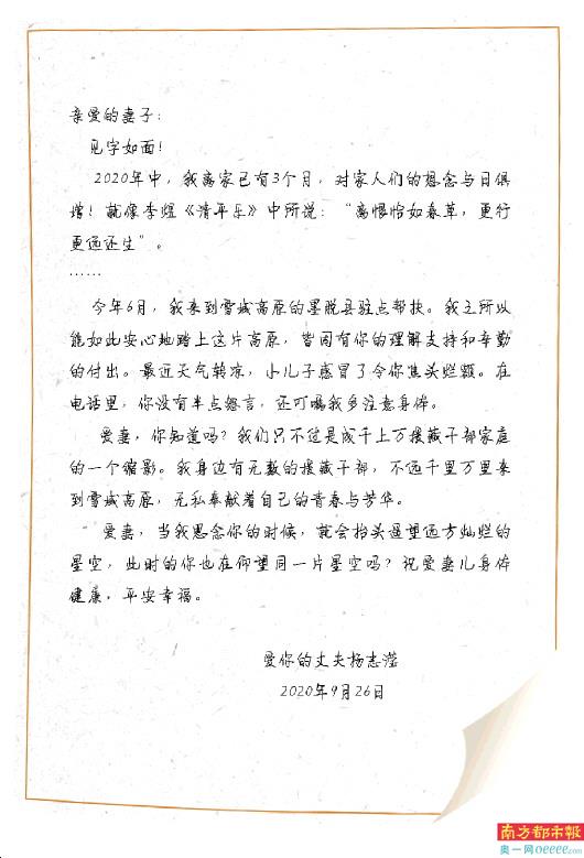 杨志滢二次援墨,背后都离不开他妻子的理解与支持。中秋佳节之际,虽不能回家与妻子共度花好月圆夜,但他借此机会写下了对妻子的思念和感激之情。