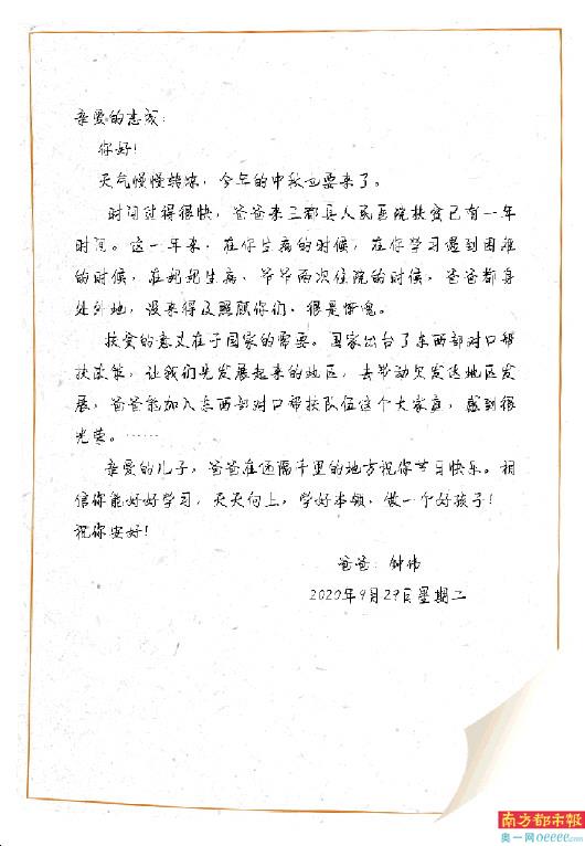 只不过,让钟伟牵挂的还有千里之外的家。中秋佳节将至,钟伟给儿子捎去一封家书,纸短情长,尽是思念。