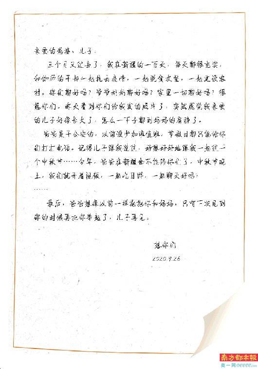 三个月又过去了,爸爸在新疆的一百天,是奋斗的一百天,每天都很充实,和伽师的干部一起抗击疫情,一起脱贫攻坚,一起建设农村。你们都好吗?爷爷奶奶都好吗?家里一切都好吗?爸爸很想你们。昨天看到你们给我发的照片了,突然感觉我亲爱的儿子好像长大了,以前不觉得你那么高呀,怎么一下子都到妈妈的肩膀了。