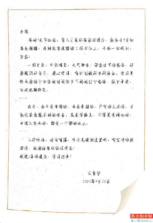 你好!见字如面。自八月底你离家回校后,我也于9月初奔赴新疆,回到教育援疆的工作岗位上,开局一切顺利,勿念!