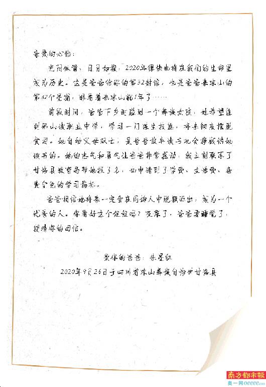 你好!光阴似箭、日月如梭,2020年很快也将在我们的生命里成为历史。这是爸爸给你的第32封信,也是爸爸来凉山的第32个星期,日子过得真快,眼看着来凉山就1年了,大人们希望日子过得慢一些,因为岁月留给我们的时间越来越少;小孩们希望日子过得快一些,因为都盼望长大,成年了很多事情都可以自己作主。但大人们有养家糊口的烦恼、有工作的压力,你现在还没办法感受;小孩子们有学习的压力,还有来自家长老师、习惯养成的各种限制,相信你现在多少有一些体会。