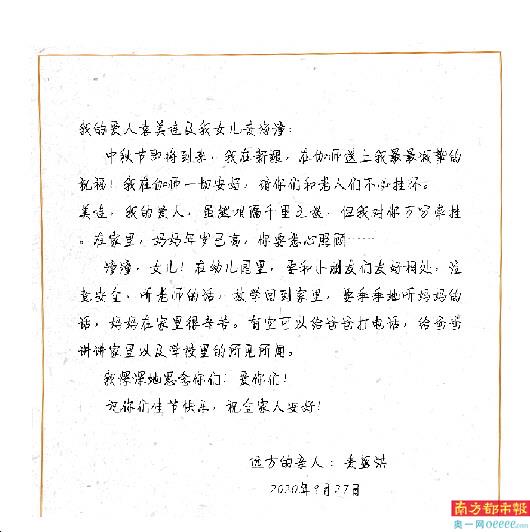 美连,我的爱人,虽然相隔千里之遥,但我对你还是万分牵挂。在家里,妈妈年岁已高,你要悉心照顾;工作中,你总不甘人后,拼命向前。一定要记住,只有身体健康,才能很好地照顾家人,你一定要保重!儿子虽已长大,但你平时仍需照料,小女儿上幼儿园,也得辛苦你多加照顾。你少了我的陪伴,我多了对你的牵挂!