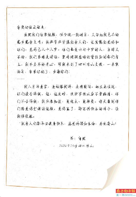 “支教很有意义,是我的一生中非常值得去做的一件事,如果条件允许,我会一直支教下去。”今年58岁的章自然是佛山顺德罗定邦中学的一名教师。2019年8月,已经57岁的他主动请缨,到四川凉山州盐源县中学校支教,是佛山对口凉山支教老师中年龄最大的,2020年,刚完成凉山州盐源县支教工作,他再次主动请缨到雷波县继续支教。中秋将至,章自然为其姐与姐夫写了一封家书,表达了他对他姐与姐夫的感激与期冀,及对亲人的思念、节日的祝福。