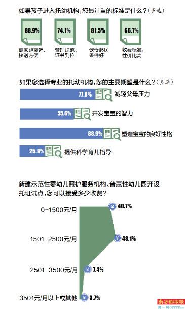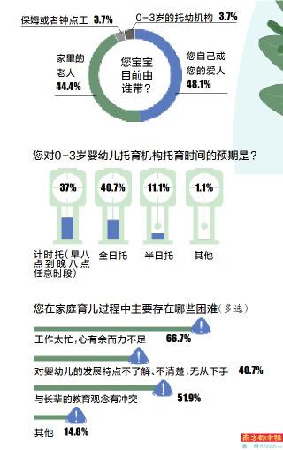 此次的调查结果显示,在把孩子送到0-3岁婴幼儿托育机构的家庭中,40.7%的家庭需要全日托,37%受访者需要计时托(早上八点到晚上八点任意时段),选择半日托的则有11.1%。