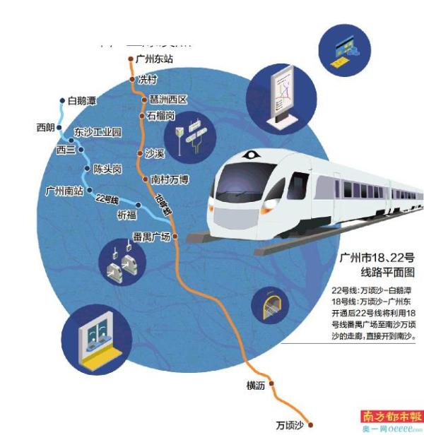 22号线在规划之初是为了重点加强南沙与广州南站的快捷联系。目前在建芳村至番禺广场段,开通后22号线将利用18号线番禺广场至南沙万顷沙的走廊,直接开到南沙。值得注意的是,以南沙作为中间节点,22号线一头连接广州中心城区,另一头联通东莞,延伸到深圳,这对打造南沙大湾区“半小时交通圈”至关重要,珠三角几何中心的南沙连结珠江东西两岸的速度将提速。