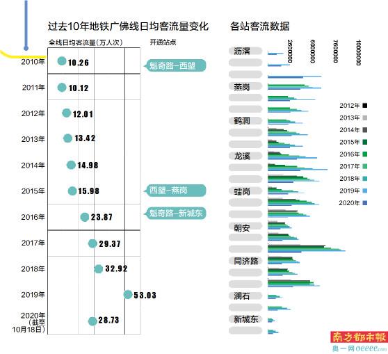 过去十年,随着全线站点陆续贯通,各个站点的客流量不断增长。横向来看,以2019年数据为例,客流量最大的站点依次是佛山祖庙站、金融高新区站,广州石溪站、燕岗站和佛山魁奇路站。其中,祖庙2019年客流量超过900万人次、金融高新区站客流量接近690万、魁奇路站超过600万。