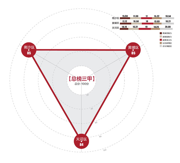 综合五个评价维度得分,南沙区跃居“营商环境榜”第一位,比上年跃升1位,在各个维度表现比较平均;并列的是黄埔区,随后是天河区。前三位的区分数差距较小,表明几个营商环境强区在改革力度和竞争势头都不相上下。全市11区今年得分都超过了75分,差距少于10分,表明各区发力营商环境改革齐头并进。