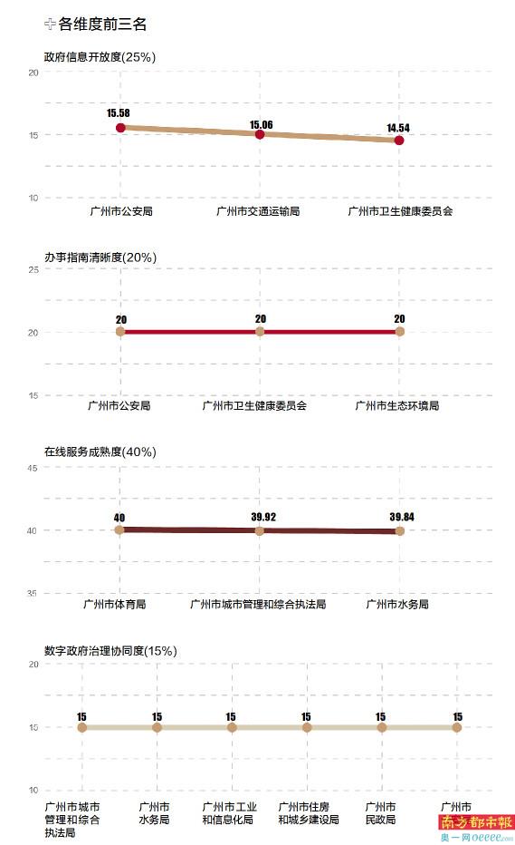 本榜单旨在考核广州市直部门“数字政府”改革建设成效、提供政务服务的质量和成色。榜单评价指标体系设置政府信息开放度、办事指南清晰度、在线服务成熟度、数字政府治理协同度四个一级指标,下设二级指标20个。