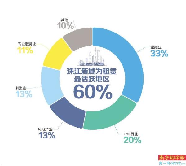 在全年度的租赁活跃度上,珠江新城为租赁最活跃的区域,60%的交易在此发生,其中金融业依旧是主打产业,占了33%,随后是TMT行业,占20%,房地产业占13%,制造业占13%,专业服务业占11%。