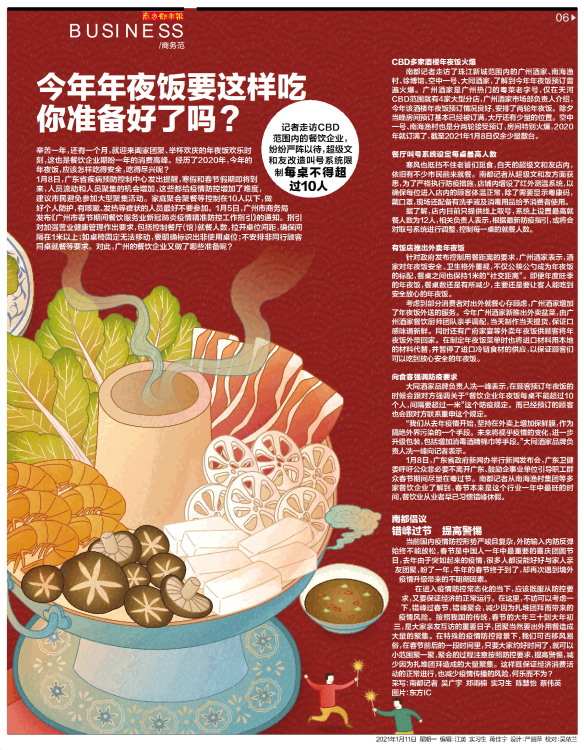 辛苦一年,还有一个月,就迎来阖家团聚、举杯欢庆的年夜饭欢乐时刻,这也是餐饮企业期盼一年的消费高峰。经历了2020年,今年的年夜饭,应该怎样吃得安全,吃得尽兴呢? 1月8日,广东省疾病预防控制中心发出提