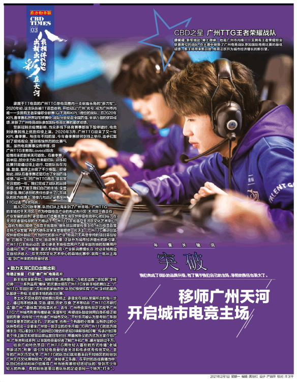 年度关键词 突破我们完成了战队的品牌升级,有了属于我们自己的主场,承担的责任也更大了。 CBD之星 广州TTG王者荣耀战队颁奖词:新军雄起,粤上巅峰。他是广州市内唯一一支拥有王者荣耀职业联赛席位的