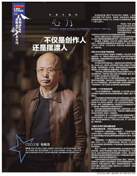 年度关键词 心 力后疫情时代,应该更多从内在出发,立足中国的民族文化,带给世界一种新的力量。 CBD之星 毛继鸿颁奖词:例外方所创始人毛继鸿,他是商人中的艺术家,设计师中的思想者。跨时尚、文化创意