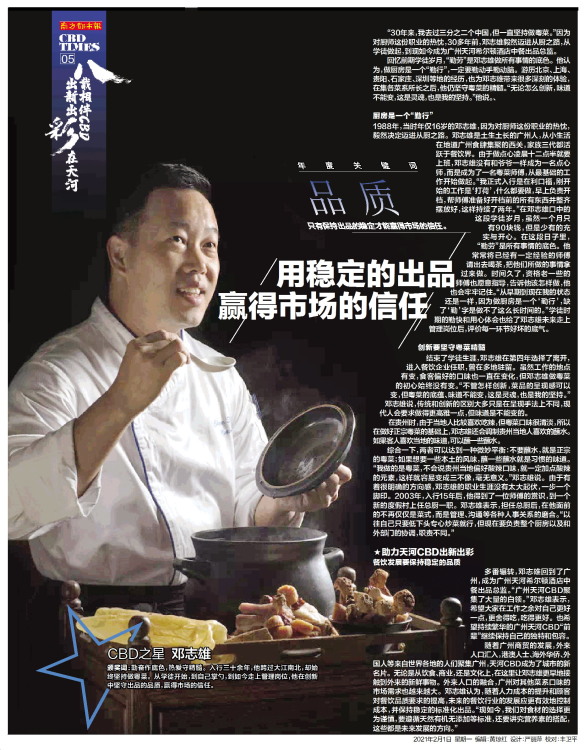 年度关键词 品 质 只有保持出品的稳定才能赢得市场的信任。 CBD之星 邓志雄 颁奖词:勤奋作底色,热爱守精髓。入行三十余年,他