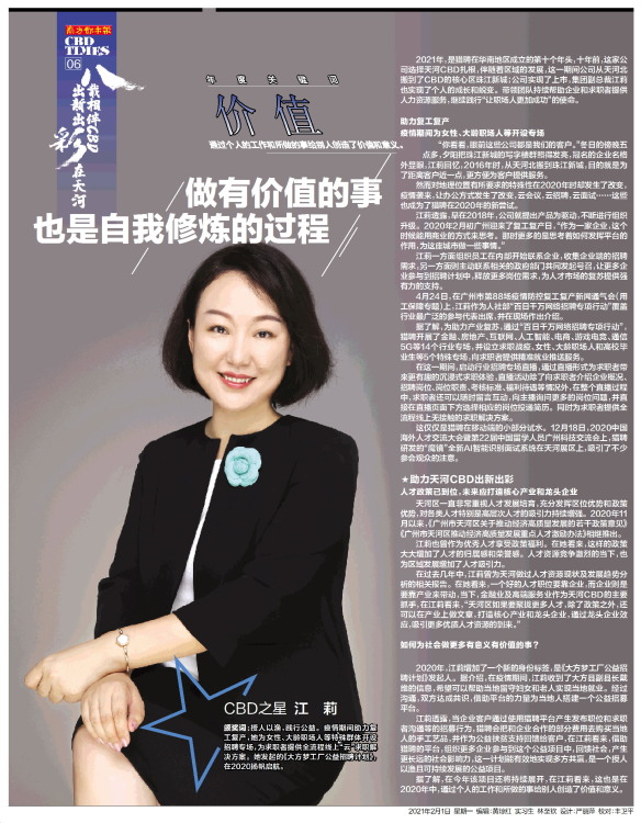 年度关键词 价 值通过个人的工作和所做的事给别人创造了价值和意义。 CBD之星 江 莉颁奖词:授人以渔,践行公益。疫情期间助力复工复产,她为女性、大龄职场人等特殊群体开设招聘专场,为求职者提供全流