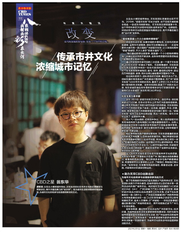 年度关键词 改 变这可能是我的职业病,这是一个创作的过程。 CBD之星 翁东华颁奖词:从街头小摊到城市地标,文和友对旧社区市井文化的还原复刻与精准定位,离不开幕后操刀的“设计师”。他为城市生活带来