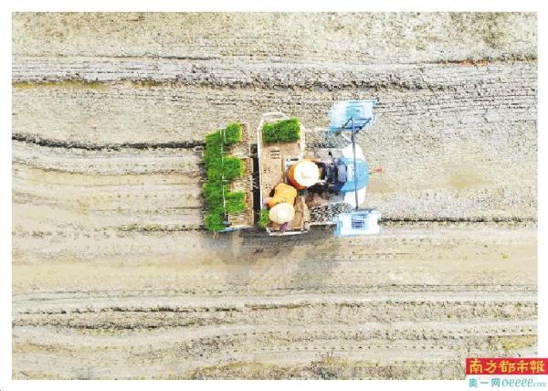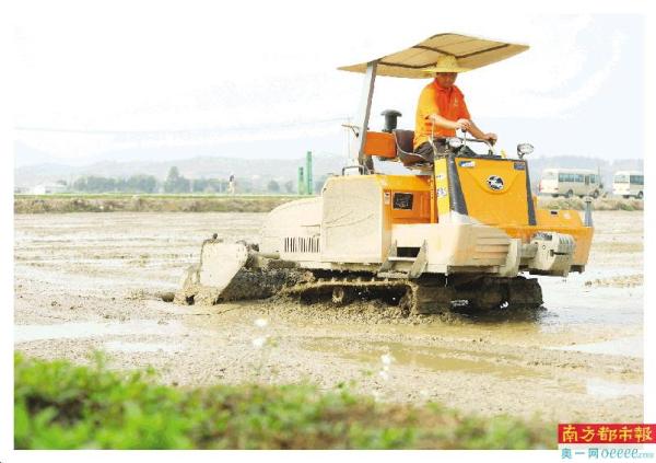 昨日上午,佛山高明区明城崇步农业园区,先进的新型插秧机正在作业,秧苗从插秧机的下方整齐快速地插入田中,一天能插秧5亩左右,而传统人力插秧一天还不到1亩。