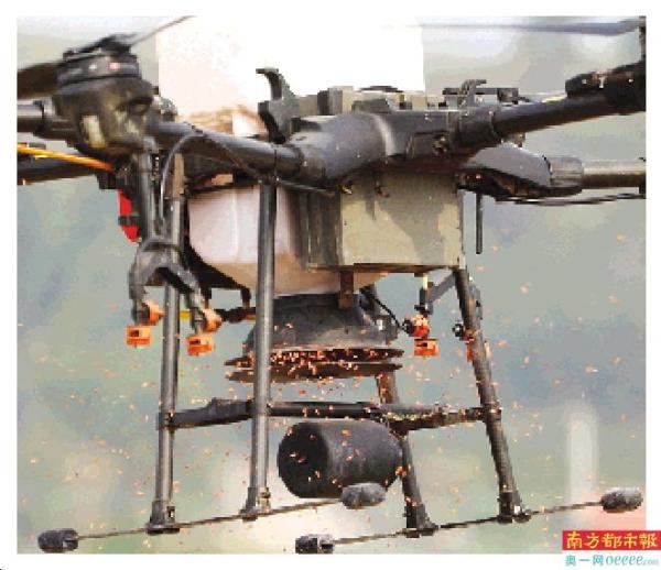无人机通过离心力和风压将种子均匀撒在田地上。