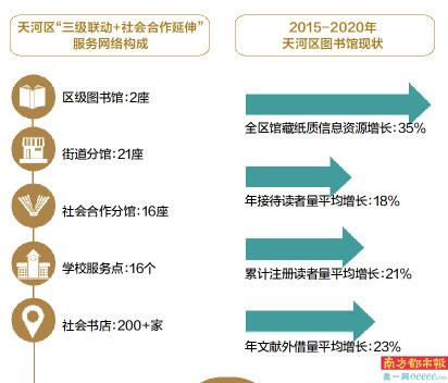 天河区建有区级图书馆2座,街道分馆21座,街道覆盖率达到100%。社会合作分馆16座,学校服务点16个,辖区内200多家社会书店积极参与,形成“三级联动+社会合作延伸”服务网络。