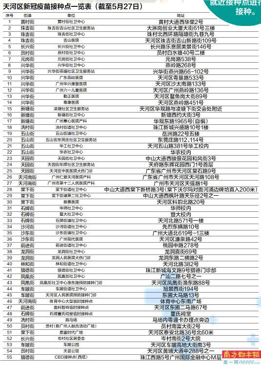 记者从天河区获悉,截至5月27日,天河区陆续启动新冠疫苗固定接种点55个,接种单元达174个,市民可选择就近接种点进行疫苗接种。