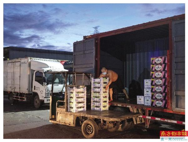 凌晨5点的江南市场进口水果交易区,商户正在搬运水果。全国50%左右的进口水果都经江南市场转运。水果采购商在冷藏车停靠的区域外等候。集装箱拖车从南沙港等港口运来的进口水果,首先会在江南市场对面的特设场地进行消杀,拖车和司机返回,市场另派牵引车将水果运至专门的进口水果交易区进行交易。交易达成后,采购商会将水果从集装箱内取出并放上冷藏车,运往全国各地及东南亚市场。