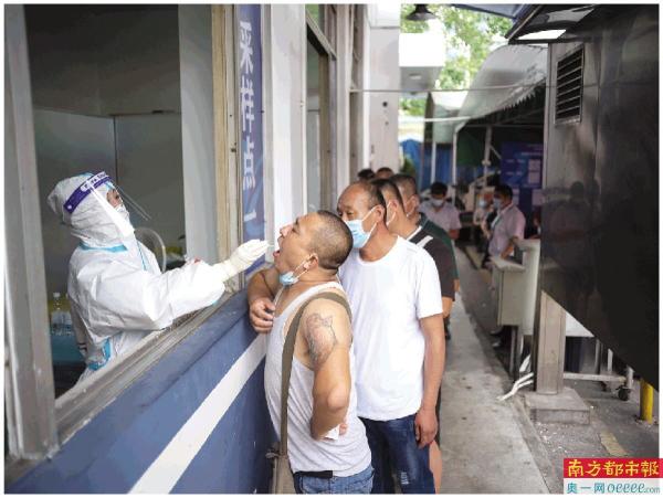 外省货车司机排队进行核酸采样。离穗需出示核酸检测阴性证明的政策施行后,卫健、公安等部门联合松洲街踩点勘察,与经营方协调,半天时间在江南市场内设置了外省货运司机核酸检测点,24小时内可出报告。核酸检测点派驻6—10名医护及工作人员,每日可检测约1000人次,已累计检测一万人次以上。