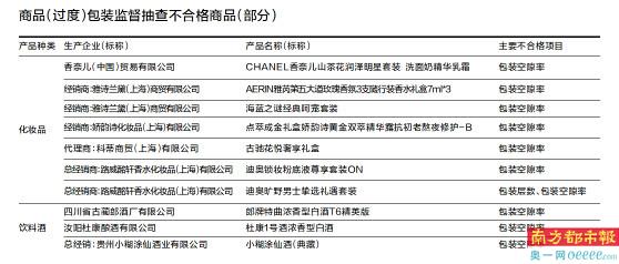 其中,在化妆品类别中,此次共抽查28家企业生产的70批次商品,发现23批次商品不合格,不合格发现率为32.9%。其中包装空隙率不合格23批次,包装空隙率不合格发现率为32.9%,包装层数不合格1批次,包装层数不合格发现率为1.4%。不合格品牌涉香奈儿、迪奥、古驰、雅诗兰黛等。