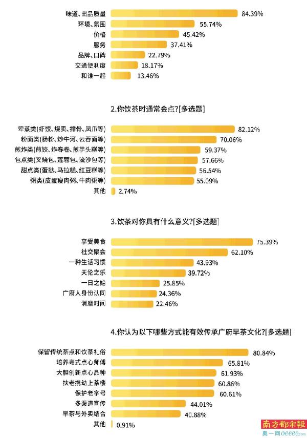 广州“5·21”疫情已经有效稳控,荔湾区又一间茶点轩上周日重开迎客,广州阿婆又可以上茶楼叹“一盅两件”了。大家中意哪些点心?知道哪些广府饮茶礼俗?南都民调中心在2021年6月24日至6月28日发起问卷调查,并于近日发布《广府早茶文化调查报告(2021)》。报告显示,四成受访者多在早上8-10点早市期间上茶楼;超八成受访者重视味道出品,其中虾饺凤爪等荤蒸类点心人气最高;中年人通常与家人一起饮茶,而90后、00后则更喜欢与朋友、同事或同学去茶楼;六成受访者认为饮茶是一种社交聚会;超九成受访者希望保留传统茶点和饮茶礼俗。
