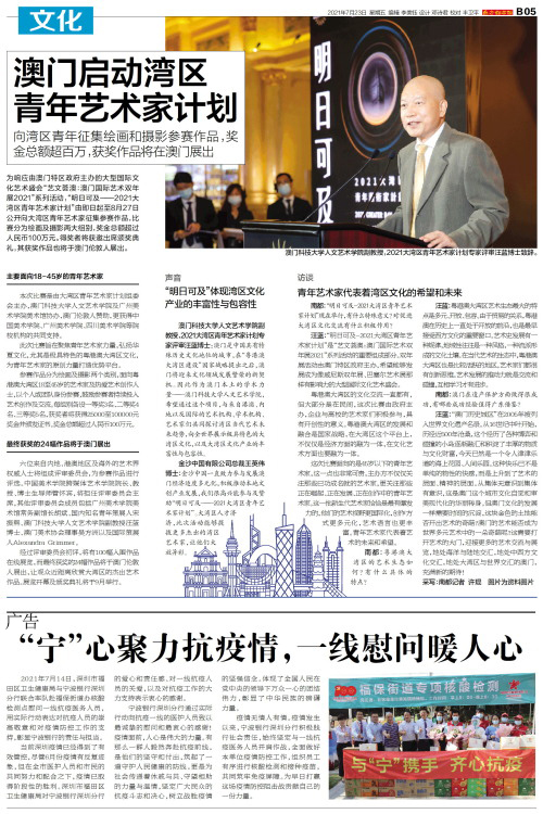 为响应由澳门特区政府主办的大型国际文化艺术盛会“艺文荟澳:澳门国际艺术双年展2021”系列活动,“明日可及——2021大湾区青年艺术家计划”由即日起至8月27日公开向大湾区青年艺术家征集参赛作品,