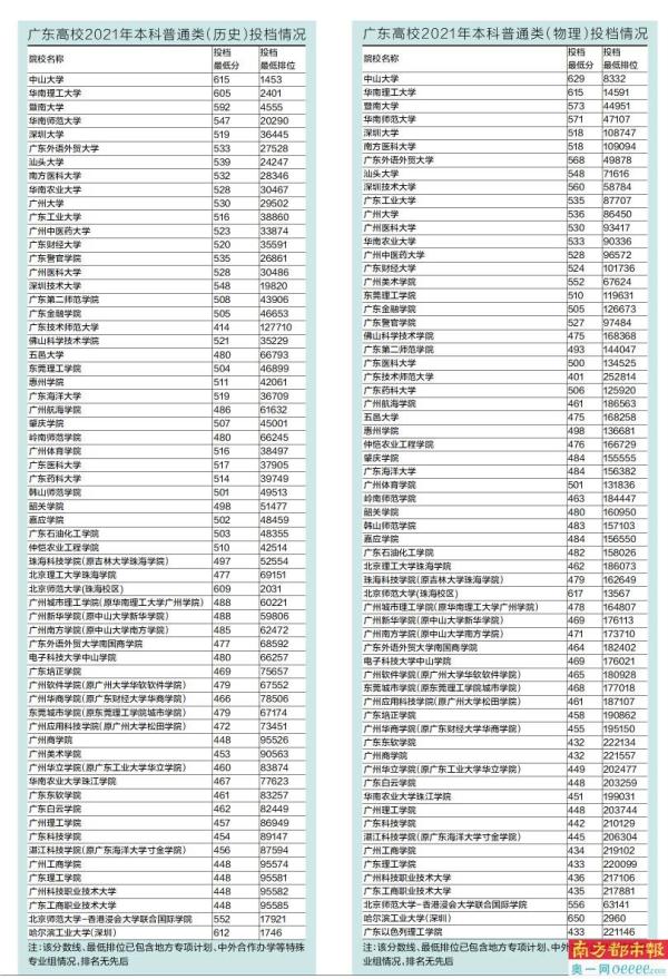 广东省2021年本科普通类(历史)投档方面,广东老牌大学依旧势头强劲。