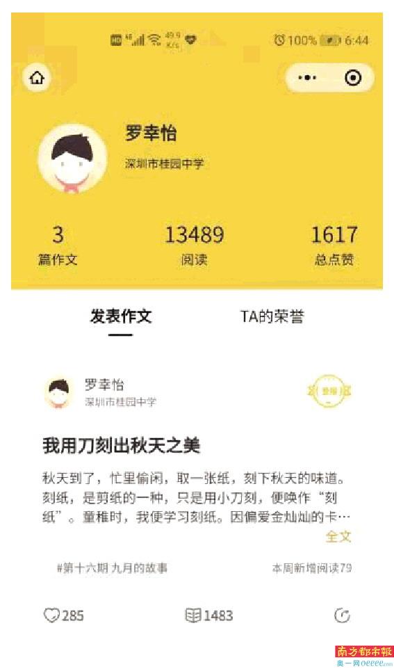 其中,针对一些重要节点,平台也推出了热点征文的征集,如高考作文大家写、中考作文大家写等,在高考首日和中考首日均第一时间收到了不同年级学生的高考作文题和中考作文题投稿上百篇,其中不乏华南师范大学附属中学、广东实验中学、中山大学附属中学、广州市第六中学、东风东小学等名校学生的投稿,社会反响热烈。有家长表示,“看到小孩的作品在报上发表,感到很开心,对于小孩而言也非常治愈。在成长的道路上,总有不少挫折,但成功的投稿并刊登,让孩子看到了希望,获得了很大的成就感。”