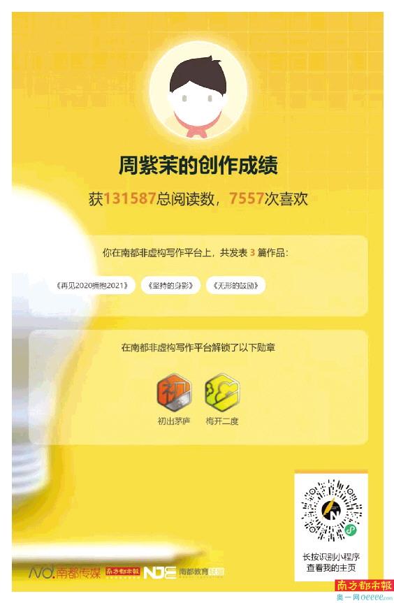 其中,值得一提的是,从2021年起,南都非虚构写作成长平台推出了每季度的“妙笔少年”评选,由报社采编、一线名师等联合评审推荐,每季度推选3名“妙笔少年”。他们将通过文字和视频分享写作心得和经验,共同探讨非虚构写作成长之路。