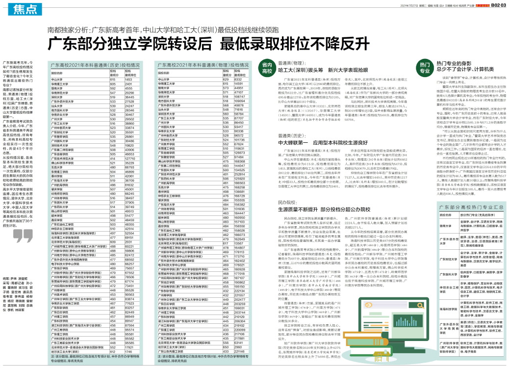 广东新高考元年。今年广东高校投档情况如何?招生格局发生了哪些变化?今年又将涌现出哪些热门专业?南都记者独家分析发现,普通类(物理)投档方面,哈工大(深圳)位居广东榜首,普通类(历史)方面,中山大学