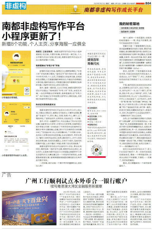 南都讯 记者梁艳燕 南都非虚构写作成长平台小程序更新啦!在这里,只要你投稿,将有你的一席之地,个人主页都为你设计好啦!即日起,南都非虚构写作成长平台小程序新增8个功能。每季度推出“妙笔少年”评选