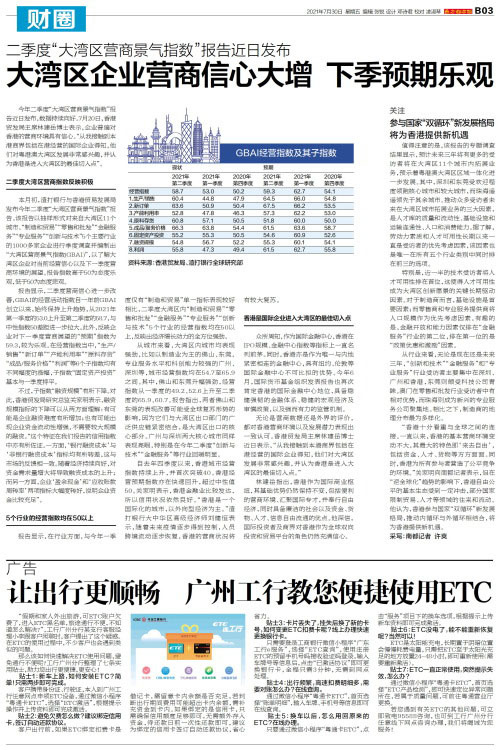 今年二季度“大湾区营商景气指数”报告近日发布,数据持续向好。7月20日,香港贸发局主席林建岳博士表示,企业普遍对香港的营商环境具有信心。“从我接触到本港商界包括在港经营的国