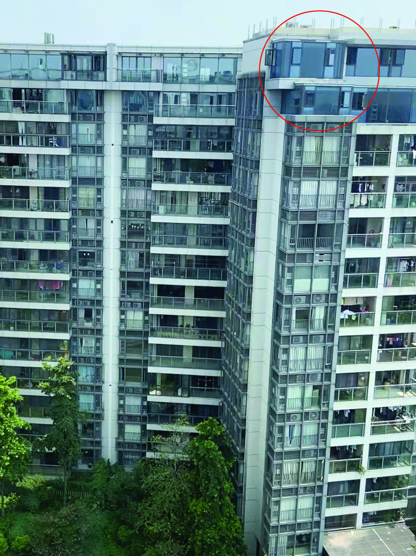 记者走访过程中,发现小区内有业主在顶层“改装”封堵阳台(圈中所示)。