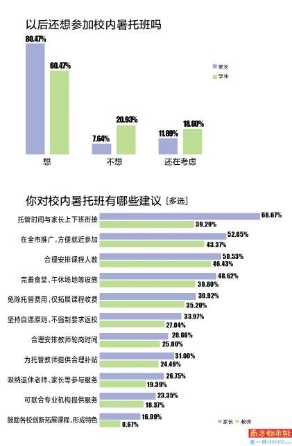 从本次调查结果来看,家长和学生都对广州今年推出的暑期校内托管服务颇为满意。由于今年只是挑选部分学校试点开展工作,一些学校的选点安排、课程设计、服务时间等尚有改进空间。随着各校吸取经验、教育部门优化托管方案,相信广州的“官方带娃”服务还会进一步完善,吸引更多家长和学生报名参加。