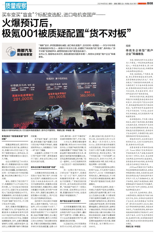 另一位预订用户林先生,之前也在厂家宣传下,迅速成为一名“小订”用户,他和许多极氪潜在购车者一样,目前也处于犹豫期,厂家能否按时按质交车,成为他购买的决定因素,“虽说国产电机不一定就比进口的差,但如果车企交车太慢,配置选装货不对板,这是消费者不希望看到的。”