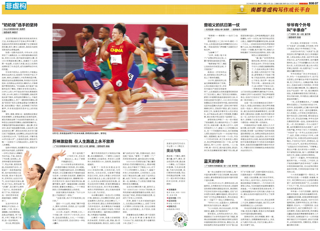 ◎广州大学附属中学大学城校区 初三(4)班 唐梓越 ◎指导老师:杨娟 那个追风跑了17年的少年,在东京奥运会上,追上了被赋予厚望的自己。 从小对体育运动痴迷的我,对速度有着迷之的热衷,所以短