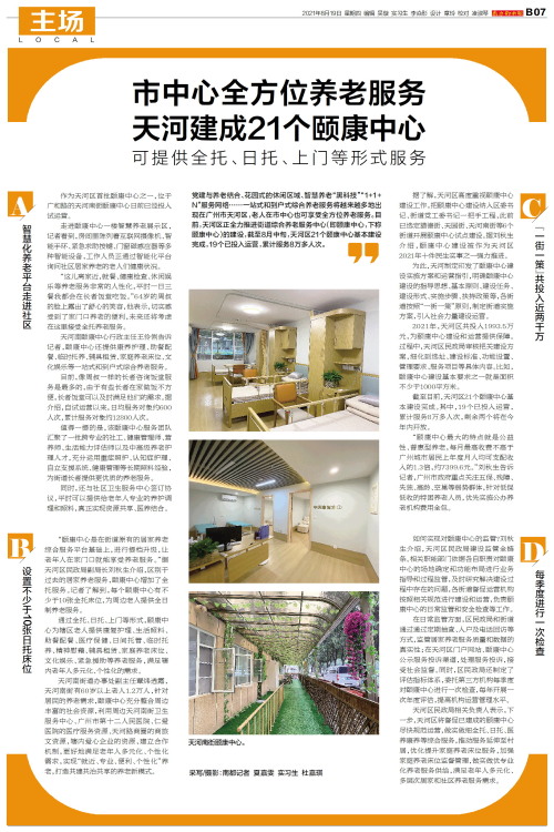 党建与养老结合、花园式的休闲区域、智慧养老“黑科技”“1+1+N”服务网络……一站式和到户式综合养老服务将越来越多地出现在广州市天河区,老人在市中心也可享受全方位养老服务。目前,天河区正全力推进街
