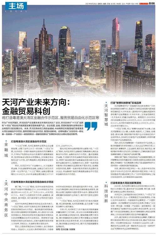作为广州经济强区,天河区的产业发展未来五年将何去何从?近日,天河区举行“十三五”成就和“十四五”规划经济高质量发展专题新闻通气会。会议透露,金融、贸易和智慧科技等优势行业将是天河的发展方向。未来,