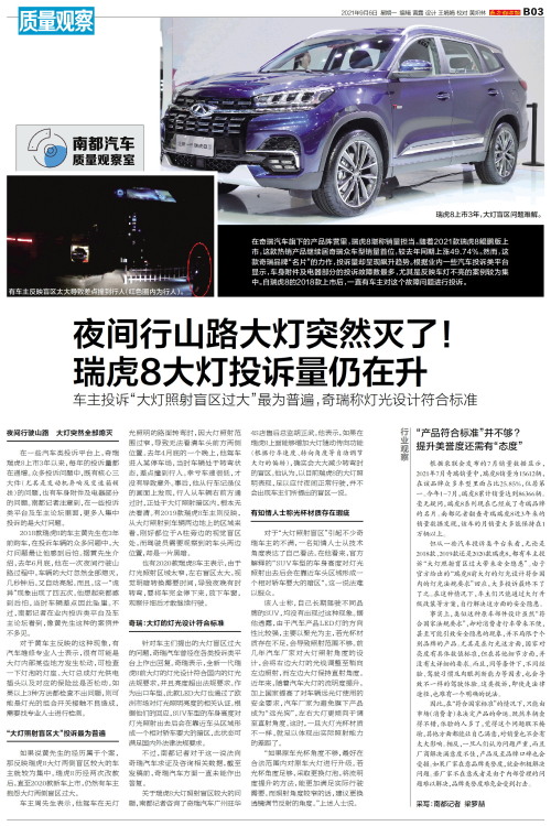 2018款瑞虎8的车主黄先生在3年前购车,在投诉车辆的众多问题中,大灯问题最让他感到后怕。据黄先生介绍,去年6月底,他在一次夜间行驶山路过程中,车辆的大灯忽然全部熄灭,几秒钟后,又自动亮起。而且,这一“诡异”现象出现了四五次。他想起来都感到后怕,当时车辆差点因此坠崖。不过,南都记者在业内投诉类平台及车主论坛看到,像黄先生这种的案例并不多见。