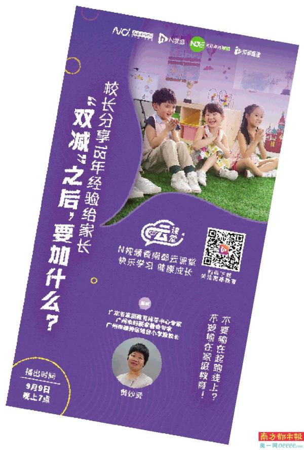 “双减”政策下的新学年,素质教育成为全社会关注的焦点,家长、学生、教师群体急需获得专业指导、优质资源、正向引导、丰富的实践及课程内容,南都以家长、老师、学生为受众,南都教育联盟优化升级“南都云课堂”,设计特色视频课,在N视频南都教育频道每周更新。“南都云课堂”将传达不焦虑不内卷的和谐教育观念,助力塑造温暖积极的家校关系及亲子关系,为家长提供帮助为孩子提供帮助。扫码N视频,看南都云课堂,让孩子快乐学习,健康成长。