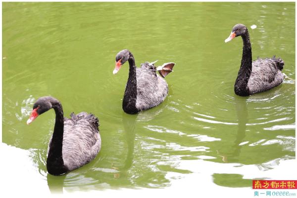 珠江公园的黑天鹅排成一列,优雅浮游湖面,划出道道涟漪。