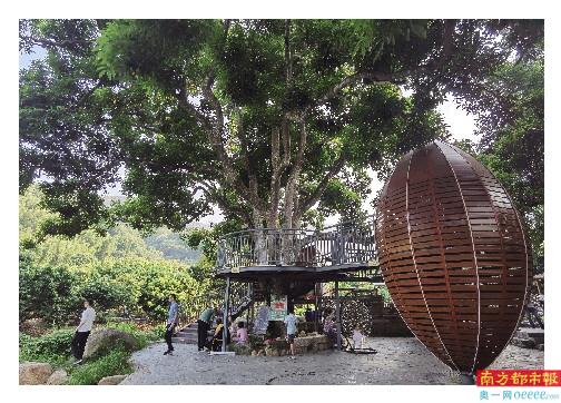 南平村委副主任邱小平向读者们介绍了南平村最著名的网红打卡点——橄榄树屋。树屋位于小镇的核心地带,有一棵一百多年树龄的乌榄树,设计师在树上搭建了楼梯、连廊还有橄榄形状的小木屋。树屋下还有很多桌椅,村民和游客们可以在这里聚会休息,“中秋节的时候,很多人在这里赏月,旁边还有一条很清澈的小溪。”南平文化广场是一个公共活动空间,主体建筑采用大型竹编艺术装置设计,暖黄色烘托着小镇的翠绿,曼妙的曲线与延绵远山相映成趣。