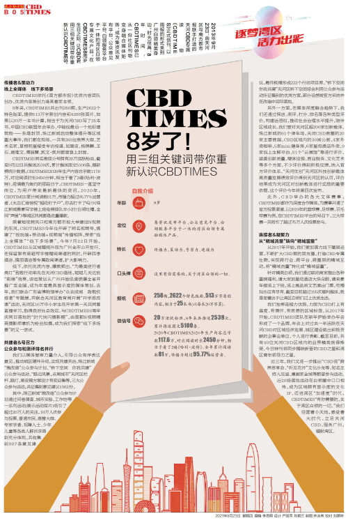 2013年9月23日,由天河区与南方都市报联手打造的天河CBD专属读物《CBDTIMES》正式创刊,以周报的形式来到广州白领精英身边。时光荏苒,8年时间,CBDTIMES已从一份社区刊物变身融合媒