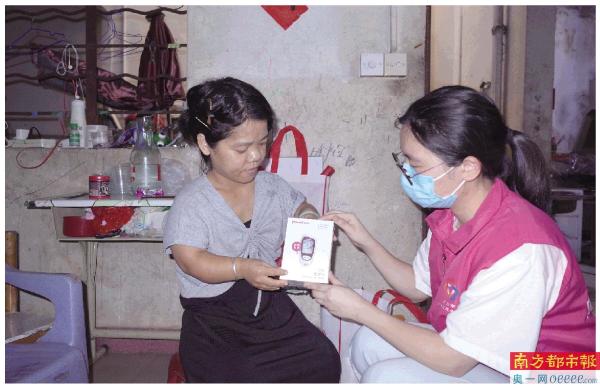 阿仪认真地听着志愿者讲解血糖仪的使用方式,细细地端详着眼前这部小仪器。阿仪妈妈也在一旁不停道谢。